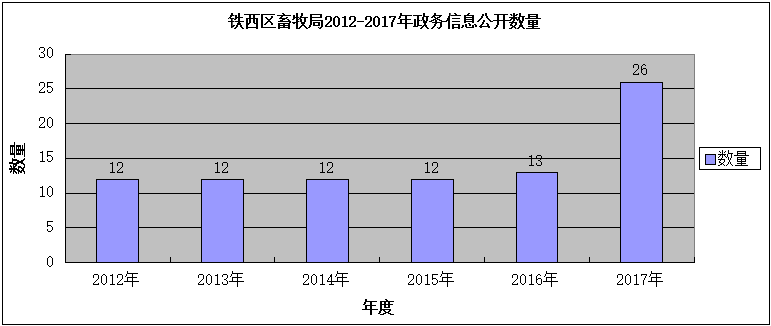 2012年至2017年铁西区畜牧业管理局共发布政府信息365bet手机开户_365bet足球现金_365bet安全上网导航数据87条,以2017年发布信息数量最多,为26条,具体信息365bet手机开户_365bet足球现金_365bet安全上网导航情况因当年工作内容和工作要求不同而有所差异。对比2012年至2017年在铁西区政府网站365bet手机开户_365bet足球现金_365bet安全上网导航信息数量(见表1),可见2017年365bet手机开户_365bet足球现金_365bet安全上网导航信息数量成倍提高,显示出局机关对信息365bet手机开户_365bet足球现金_365bet安全上网导航工作的重视,并取得较好成绩。